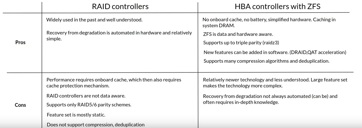 hybrid hardware (HBA) + software (ZFS) solutions is more flexible than a hardware only RAID solutions -> Software can be easily improve, enhanced or replaced entirely